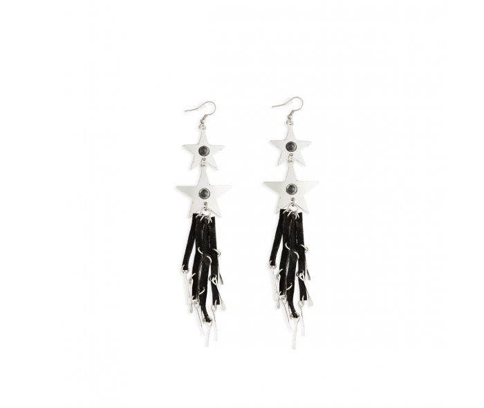 This pair of gorgeous earrings feature stacked silver stars, beneath which drapes leather strands accented with silver charms. You'll love the eye-catching look.